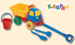 Fremstillet i kvalitets plast. Lås trækhåndtaget under lastbilen og du har en sjov lastbil med tiplad. Du kan nemt frigøre trækhåndtaget igen og nu har du en glad lille trækvogn. Incl. spand, skovl og rive. Længde uden håndtag 50 cm.