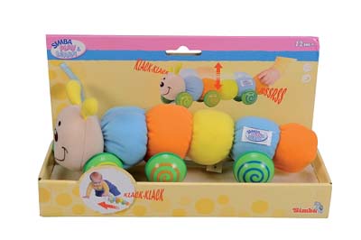 Små børn har stor fornøjelse af denne sjove larve. Den dejlige og bløde træklarve følger pænt efter barnet når der trækkes i snoren. Den bevæger sig op og ned på midten når den køre, mens indbygget rangle og knitrepapir sørger for akustisk stimulering. Længde 26 cm.