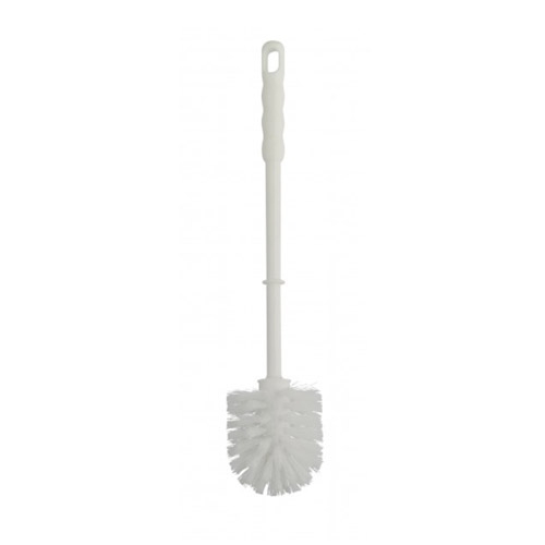 Hvid toiletbørste med håndtag i plast, der er fremstillet med børster og plast midte med gevind.
