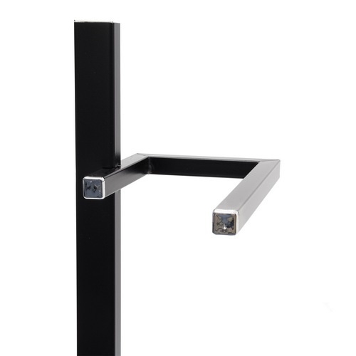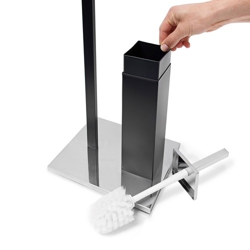 Fritstående toiletpapirsholder med toiletbørste i elegant firkantet design, fremstillet i pulverlakeret sort stål, plast og blankpoleret rustfrit stål. Toiletbørsteholder med plast indsats og toiletbørste med stål håndtag. Stativet er udstyret med skridsikre gummifødder.
