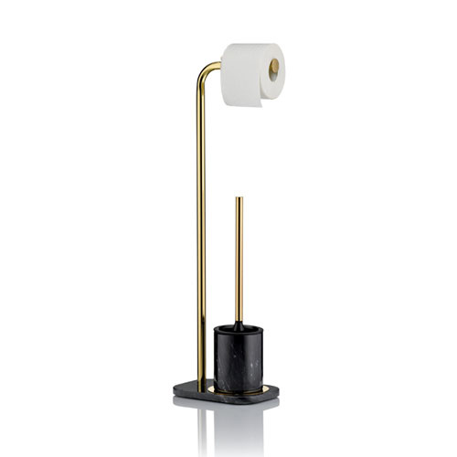Eksklusiv Liron toiletrulleholder med toiletbørste fra tyske Kela. Fremstillet i ægte marmor med lækkert sort finish i topkvalitet. Håndtaget er fremstillet i rustfrit stål med guld lakering. Forsynet med indvendig plastbeholder, udskifteligt toiletbørstehoved, samt filt under bunden af toiletrulleholderen. Kombinationen af sort marmor og guld giver et stilfuldt udtryk til ethvert badeværelse. Kvaliteten er bestemt i højsædet i denne moderne badeværelsesserie, hvor du kan tilkøbe en hel kollektion af matchene tilbehør til badeværelset.
