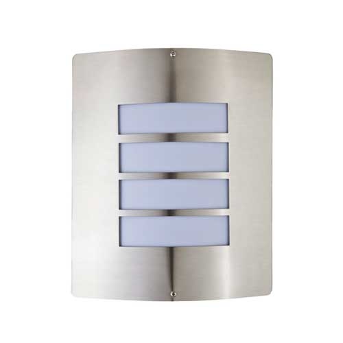 Stilfuld kvalitets væglampe til udendørs brug, der er fremstillet i rustfrit stål og plast. En ideel løsning til belysning af indgangsparti, gårdsplads, terrasse m.m.