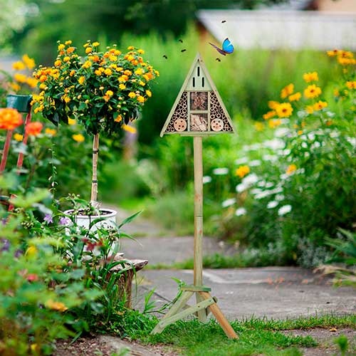 Insekthotel med stander og metalgitter, der er fyldt med bambusrør, fyrkogler og træ, som vil hjælpe dig med at bibeholde en sund økobalance i haven. Insekthotellet har fået grøn vandbaseret maling og placeres tæt på pollenbærende træer, blomster og krydderurter. Placer gerne insektboet et sted, hvor det kan få meget sollys og knap så meget vind og regn. Du bør ikke lakere eller male insekthotellet, da det kan være til fare for insekterne. Særligt egnet til bier, mariehøns, biller og mange andre insekter.