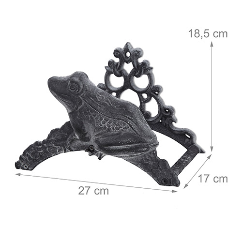 Praktisk og dekorativt vægmonteret ophæng til haveslangen i nostalgisk bronze design med frø. Haveslangeholderen er fremstillet i solidt støbejern, der gør den meget stabil og holdbar i alt slags vejr. Nem at fastgøre på mur, plankeværk m.m. Tåler maksimal belastning på omkring 25 kg. Velegnet til haveslanger op til 30 meters længde.