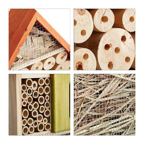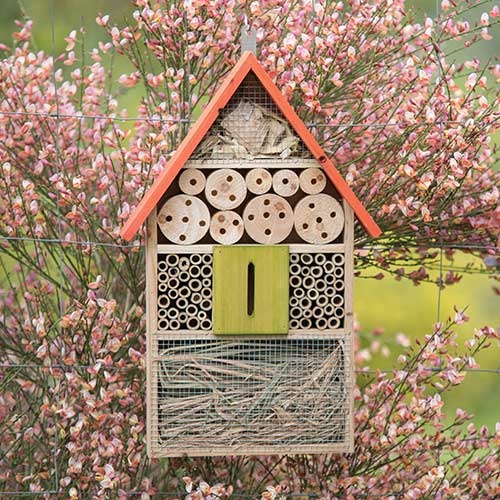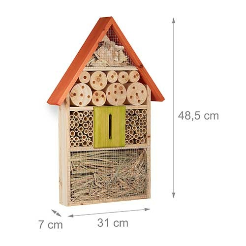 Insekthotel i træ til ophæng med vandbaseret orange tag og metalgitter, der er fyldt med tagrør, bambusrør og træ, som vil hjælpe dig med at bibeholde en sund økobalance i haven. Insekthotellet placeres tæt på pollenbærende træer, blomster og krydderurter og gerne i en højde på mellem 1,5-2 meter over jorden, hvor insekterne trives bedst. Placer gerne insektboet et sted, hvor det kan få meget sollys og knap så meget vind og regn. Du bør ikke lakere eller male insekthotellet, da det kan være til fare for insekterne. Særligt egnet til sommerfugle, bier, mariehøns, biller og mange andre insekter. Åbningen til sommerfuglene måler ca. 6,5 x 1 cm.