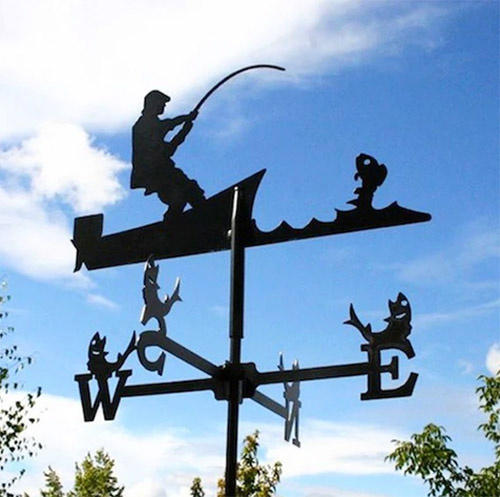 Stor vejrhane med lystfisker i virkelig god kvalitet til opsætning på tagryg, altan eller i haven m.m. Fremstillet i 1,2 mm. stålplade med præcis laserskæring. Kraftig vejrbestandig overfladebehandling i sort pulverlak. Vejrhanen har flere monteringsmuligheder og derfor er det muligt at montere den på taget, men også at bruge den som havedekoration.