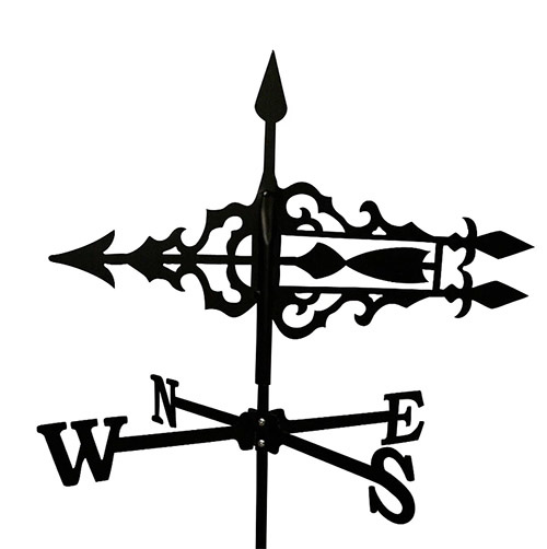 Vejrhane med pil i virkelig god kvalitet til opsætning på tagryg, altan eller i haven m.m. Fremstillet i 1,2 mm. stålplade med præcis laserskæring. Kraftig vejrbestandig overfladebehandling i sort pulverlak. Vejrhanen har flere monteringsmuligheder og derfor er det muligt at montere den på taget, men også at bruge den som havedekoration.