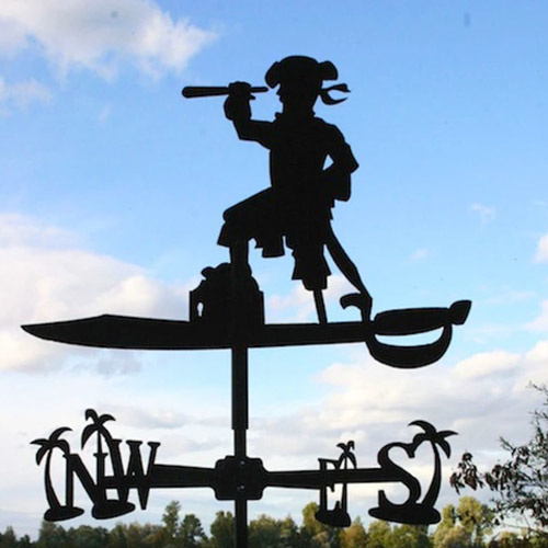 Vejrhane med pirat i virkelig god kvalitet til opsætning på tagryg, altan eller i haven m.m. Fremstillet i 1,2 mm. stålplade med præcis laserskæring. Kraftig vejrbestandig overfladebehandling i sort pulverlak. Vejrhanen har flere monteringsmuligheder og derfor er det muligt at montere den på taget, men også at bruge den som havedekoration.